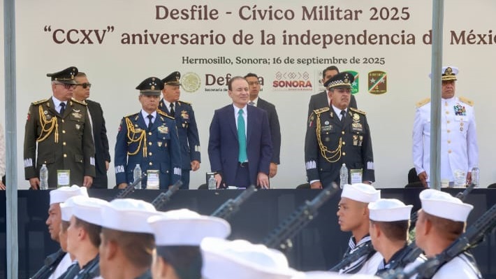 ![]() Conmemora gobernador Alfonso Durazo el 215 aniversario de la Independencia de México con desfile cívico-militar Redacción/EL GUAYMENSEHermosillo, Sonora; 16 de septiembre de 2025.- Ante cientos de familias que acudieron para disfrutar del tradicional espectáculo del desfile cívico militar, por la celebración para conmemorar el 215 aniversario de la Independencia de México, el gobernador Alfonso Durazo Montaño encabezó la ceremonia que contó con la participación de mil 488 personas y el despliegue de 79 unidades automotores. El mandatario estatal estuvo acompañado por autoridades militares y representantes del poder legislativo y judicial, así como de la Guardia Nacional, Secretaría de Marina y de la Secretaría de Educación y Cultura (SEC), para presenciar el acto de festividad mexicana. Desfilaron ante el pueblo sonorense una bandera monumental, seis bandas de guerra, seis banderines, 300 elementos del Ejército Mexicano, 155 integrantes de la Guardia Nacional, 64 militares de la Fuerza Aérea, 122 integrantes de la Secretaría de Guerra y Marina, 112 soldados del Servicio Militar Nacional, 65 integrantes de corporaciones de Seguridad Pública Estatal y Municipal, 565 alumnos de planteles educativos, 15 integrantes de Bomberos de Hermosillo,15 de Cruz Roja Mexicana, 25 de rescate juvenil, 50 del pentatlón de Sonora, 75 vehículos de diferentes corporaciones, cinco motocicletas, y 10 binomios canófilos. Al gobernador Alfonso Durazo lo acompañaron Carlos de Jesús Gracia Ríos, comandante de la Región Aérea Militar del Noroeste; Crisóforo Martínez Parra, coordinador territorial de la Guardia Nacional; Felipe González Moreno, comandante de la Cuarta Zona Militar; Daniel Escobedo Escobedo, comandante de la Segunda Región Naval; Rafael Acuña Griego, presidente del Supremo Tribunal de Justicia del estado de Sonora. Así como María Eduwiges Espinoza Tapia, presidenta de la Mesa Directiva del Congreso del Estado; Eduardo Acuña Padilla, secretario del Ayuntamiento de Hermosillo; Germán Alejandro Frías Moreno, comandante de la Base Aérea Militar número 18; Anastasio Santos Álvarez, coordinador Estatal de la Guardia Nacional en Sonora; Gustavo Rómulo Salas Chávez, Fiscal General de Justicia; Braulio Martínez Navarrete, secretario de Seguridad Pública; Camilo Constantino Rivera, secretario técnico de la Mesa Estatal de Seguridad; y Froylán Gámez Gamboa, secretario de Educación y Cultura en Sonora. |