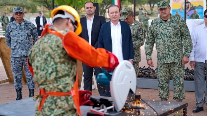 ![]() Gobernador Alfonso Durazo retira de las calles más de 900 armas y refuerza la seguridad en Sonora Redacción/EL GUAYMENSE Hermosillo, Sonora; 16 de febrero de 2026.- Como resultado de acciones firmes de inteligencia interinstitucional para fortalecer la integridad de las y los sonorenses a través de la Mesa Estatal de Seguridad, el gobernador Alfonso Durazo Montaño encabezó la ceremonia de destrucción de armamento y municiones a disposición de la Secretaría de la Defensa Nacional (Sedena). En esta ocasión fueron destruidas 625 armas largas, 350 cortas, 4 mil 485 cargadores, y 212 mil 286 cartuchos, los cuales ya no podrán ser empleados por la delincuencia organizada para causar daño a la sociedad. Todo el armamento que fue destruido se aseguró durante operativos coordinados en distintos municipios de Sonora. El gobernador Durazo Montaño mencionó que estas armas que salen de circulación eran utilizadas para llevar a cabo actividades ilícitas, mismas que anteriormente estaban en manos de criminales, por lo que, con este trabajo se da un paso firme hacia el debilitamiento de los grupos criminales que operan en el estado. “Todas estas armas representan una parte del esfuerzo que hacen las instituciones de seguridad de los tres órdenes de gobierno que participamos en la Mesa Estatal de Seguridad Pública. Pero hablar de este número de armas 975, 212 mil cartuchos y más de 4 mil cargadores habla de un esfuerzo extraordinario”, indicó. El mandatario estatal refrendó su compromiso para continuar con la cooperación con instituciones de todos los órdenes de gobierno para avanzar en el proceso de desarme de las organizaciones criminales. Durante el evento de destrucción de armamento acompañaron al gobernador Durazo, José Manuel Guevara Castillo, comandante interino de la Cuarta Zona Militar; Juan Martín Aguilar Morales, comandante de la Segunda Región Naval; Rafael Acuña Griego, presidente del Supremo Tribunal de Justicia del Estado; Alejandra López Noriega, presidenta de la mesa directiva del Congreso del Estado; Jaime Enrique Félix Jiménez, comandante de la 45 Zona Militar; Anastasio Santos Álvarez, coordinador estatal de la Guardia Nacional de Sonora; Braulio Martínez Navarrete, secretario de Seguridad Pública de Sonora; Eduardo Acuña Padilla, secretario del Ayuntamiento de Hermosillo; Alberto Flores Florián, jefe de Estado Mayor de la Región Aérea del Noroeste; y Francisco Sergio Méndez, delegado de la Fiscalía General de la República en Sonora. |